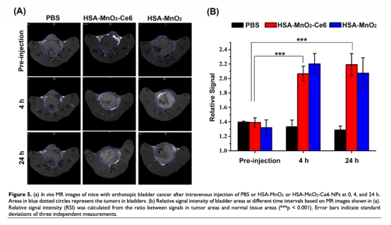 6 來自圖5a和5b:磁共振成像顯示注射NPs后膀胱癌區域的T1信號增強,且在pH 6.5時信號更強。研究意義是表明NPs能作為MRI對比劑,用于腫瘤診斷和治療監測。