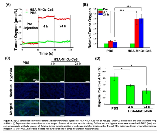7 來自圖6a和6b:使用氧氣微傳感器測量腫瘤氧氣含量,注射NPs后氧氣濃度從12μM增加到55μM(4小時)和53μM(24小時),增加約3.5倍。研究意義是直接證明NPs在體內能有效改善腫瘤缺氧狀態。