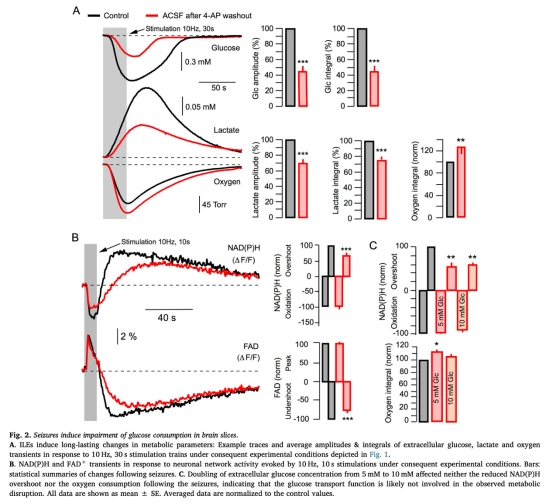 1 數(shù)據:癲癇發(fā)作后葡萄糖消耗減少,表現(xiàn)為刺激誘導的葡萄糖瞬變幅度和積分降低。研究意義:表明癲癇發(fā)作直接抑制葡萄糖利用,可能導致腦低代謝。來源:圖2A。