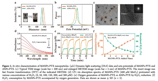 2 數據:氧氣生成和H2O2消耗能力,使用Clark氧氣探頭測量。研究意義:MANPs-PTX在H2O2存在下可持續生成氧氣,同時消耗H2O2,證明其能改善腫瘤缺氧。來源:圖2e、f。