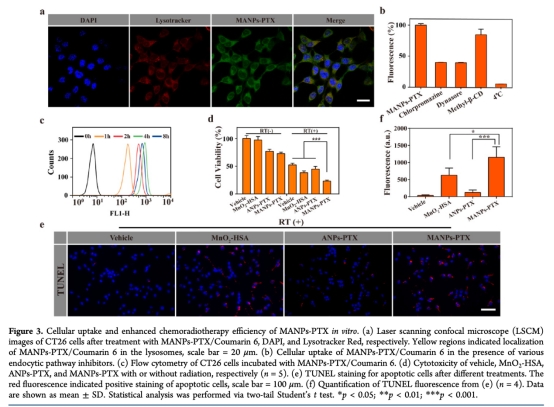 3 數據:細胞攝取和內化途徑,通過流式細胞術和共聚焦顯微鏡測量。研究意義:MANPs-PTX主要通過網格蛋白和小窩蛋白介導的內吞途徑進入細胞,定位于溶酶體,為藥物遞送提供機制 insight。來源:圖3a、b、c。