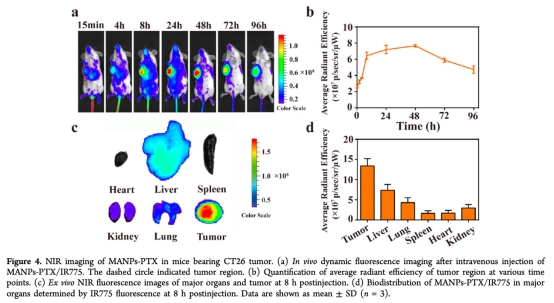 5 數據:體內生物分布,通過近紅外熒光成像測量。研究意義:MANPs-PTX在腫瘤中積累,峰值在48小時,表明EPR效應介導的靶向性,利于局部治療。來源:圖4a、b、c、d。