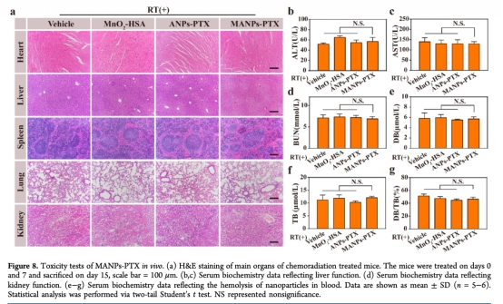 9 數據:毒性測試,通過血清生化和組織切片評估。研究意義:MANPs-PTX對肝、腎功能無顯著影響,顯示良好生物安全性。來源:圖8a、b、c、d、e、f、g。