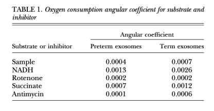 1. 氧消耗率:通過丹麥Unisense電極測量,數據顯示外泌體在NADH和琥珀酸存在下消耗氧氣,早產外泌體的氧消耗低于足月外泌體。數據來自圖3和表1。研究意義是證明外泌體具有功能性電子傳遞鏈,支持線粒體外氧化磷酸化概念,并顯示早產外泌體呼吸能力不成熟。