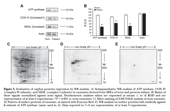 5. 呼吸復合物蛋白表達:通過Western blot分析,顯示外泌體表達ND4L(復合物I)、COX IV(復合物IV)和ATP synthase β亞基,足月外泌體表達更高。數據來自圖5。研究意義是證明外泌體含有與線粒體相同的氧化磷酸化蛋白,支持其呼吸能力源于類似機制。
