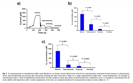 3. 對照組數據:無植入物時,骨髓中H2濃度為6±3 μM,皮下組織為5±2 μM,皮膚表面為2±1 μM(按壓)和未檢測到(輕觸)。這些數據來自文本。研究意義在于排除背景干擾,確認H2信號源自鎂降解,增強測量可靠性。