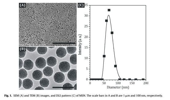 1. 從圖1的SEM和TEM圖像顯示MSN的形態和尺寸約50 nm,單分散性好,研究意義是MSN的尺寸和結構有利于高效細胞攝取和藥物負載,為納米藥物設計提供基礎。
