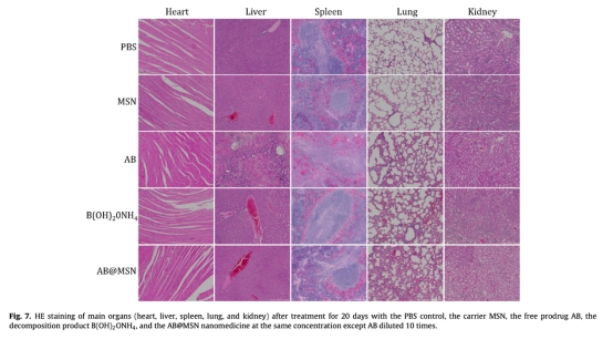 6. 從圖6和7的體內實驗數據顯示AB@MSN抑制腫瘤生長,小鼠存活率高,器官無損傷,研究意義是驗證AB@MSN在體內的有效性和生物安全性,支持其臨床轉化潛力。