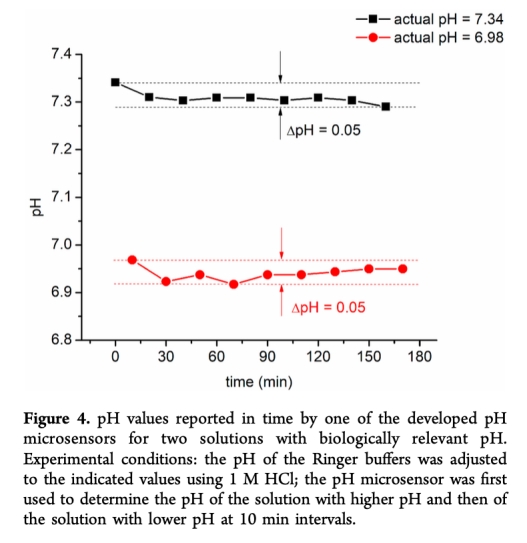 3. pH微傳感器的穩(wěn)定性數(shù)據(jù):在3小時(shí)內(nèi)pH漂移約0.05單位,表明傳感器適合長時(shí)間實(shí)驗(yàn)。這些數(shù)據(jù)來自圖4,顯示了pH隨時(shí)間的變化。研究意義:證明傳感器在細(xì)胞測量中穩(wěn)定,能夠捕捉細(xì)微pH變化而不受漂移影響。