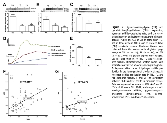 氫硫化物生成酶表達(dá)下調(diào)在足月和早產(chǎn)分娩中下調(diào)絨毛膜15-羥基前列腺素脫氫酶的表達(dá)