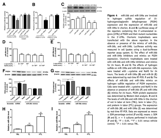 4. miRNAs介導(dǎo)的數(shù)據(jù):來自圖4A-I,熒光素酶實(shí)驗(yàn)顯示miR-26b和miR-199a直接靶向PGDH 3'-UTR;氫硫化物抑制這些miRNA表達(dá),且其 mimics 逆轉(zhuǎn)氫硫化物對PGDH的上調(diào)作用;臨床樣本中TL和PTL組miR-26b和miR-199a表達(dá)上調(diào)。研究意義:揭示了氫硫化物通過調(diào)控miRNAs來調(diào)節(jié)PGDH的表觀遺傳機(jī)制,豐富了分娩的分子網(wǎng)絡(luò)理解。