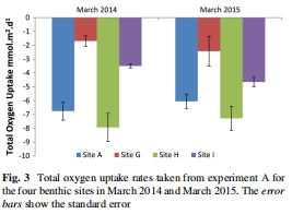 總氧氣吸收:使用了三種不同的沉積物柱培養實驗(實驗A、B、C),通過監測上覆水中氧氣濃度的變化來計算總氧氣吸收速率。這提供了底棲群落總代謝的積分測量。