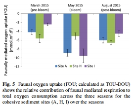 動物群作用關鍵:在粘性沉積物中,底棲動物群(包括生物擾動和自身呼吸)對總氧氣吸收的貢獻遠大于單純的分子擴散,是碳礦化的主要驅動者,尤其是在食物供應充足的水華期。
