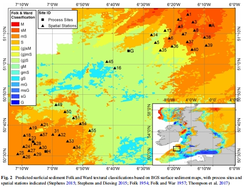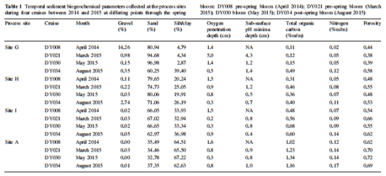 站點選擇與采樣:在凱爾特海選擇了四個代表性過程站點(A、G、H、I),涵蓋從粘性(泥質)到滲透性(沙質)的沉積物梯度。這些站點在2014年(4月)和2015年(3月、5月、8月)進行了四次航次采樣,以捕捉春季水華前、水華期和水華后的季節變化。同時,在2015年3月的空間調查中額外采樣39個站點,以覆蓋更廣的沉積物類型范圍。