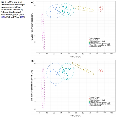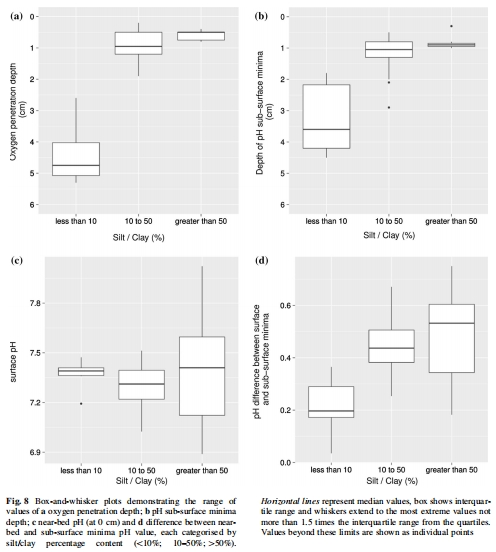 數據來源:Fig. 7顯示氧氣滲透深度和pH最小值深度與粉砂/粘土含量的關系;Fig. 8用箱形圖展示了不同粉砂/粘土含量類別的參數范圍。