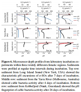 研究意義:這些剖面是識別電纜細菌活動的直接證據。e-SOx會導致典型的化學特征:表層氧化區出現pH極大值(因氧還原消耗質子),深層出現pH極小值(因硫氧化產生質子),并形成寬闊的亞氧化區(O?和H?S均缺失)。例如,Figure 1示意圖展示了該代謝過程,Figure 3和 Figure 6的剖面數據直接顯示了不同站點的這種指紋。這些數據證明了電纜細菌在多種環境中的活性,并允許定量比較活動強度(如pH偏移幅度ΔpH)。