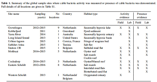 研究意義:這些數據用于分析電纜細菌分布的環境控制因素。例如,Table 1顯示電纜細菌在有機質豐富的細粒沉積物中更常見,有助于定義其生態位。