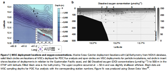 現場采樣與分級:研究在ETNP的OMZ沿近岸到遠海梯度設置站點(圖1),使用Marine Snow Catchers (MSCs)這一特殊設備收集水體中不同沉降速率的顆粒物。研究人員將顆粒物分為 “快沉降”(如聚集體、糞球)和 “慢沉降”兩類,從而分別研究它們的命運。