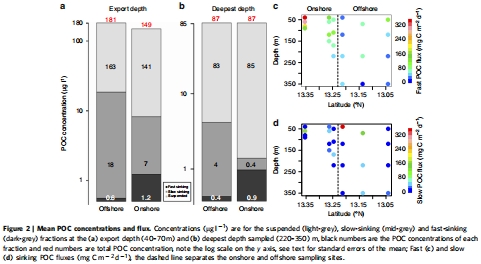 測量指標:通過過濾MSC不同層級的水樣,測量了懸浮、慢沉降和快沉降顆粒物中的POC濃度(圖2a, b)和垂直通量(圖2c, d)。