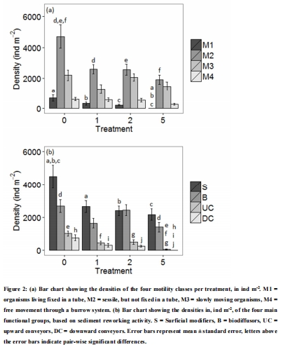 研究意義:圖1和圖2清晰地顯示了沉積脅迫對群落的選擇性影響。總密度和物種豐富度在T5處理中顯著降低。圖2a表明,低運動能力的類群(M1, M2)對沉積最為敏感,其密度隨沉積層增厚而急劇下降。而高運動能力的類群(M4)受影響較小。這直接證明沉積事件通過選擇性死亡率改變了群落的功能性狀組成,而非無差別地影響所有生物。
