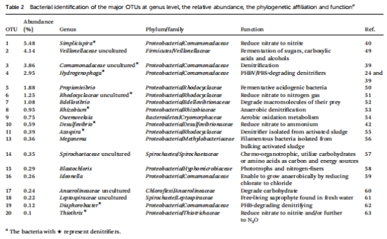 研究意義:數據表明,生物膜群落由具有特定功能的菌群構成。在門水平,變形菌門(Proteobacteria)占主導(75.6%)。在屬水平,表2顯示前20個OTU中有9個是已知的反硝化菌屬(如Simplicispira, 總豐度約16%),這從生物學角度直接解釋了系統高效脫氮的原因。同時,也檢測到一些具有有機物降解和酸化功能的菌屬(如Veillonellaceae),它們可能負責將PBS大分子降解為小分子,供反硝化菌利用,形成了功能協同的微生物群落。