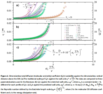測量/計算指標:根據氧氣微剖面計算得到的總有效擴散系數Et,并將其無量綱化(Et/ν,ν為運動粘性系數)隨無量綱高度y+的變化關系。圖2a-c展示了Et/ν與y+的關系及不同的參數化方案。