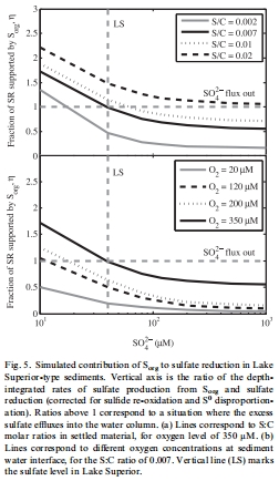 有機硫是低硫酸鹽環境中硫酸鹽還原的主要驅動力:在硫酸鹽濃度低于500 μM的環境中,沉積物中有機硫的礦化可以貢獻超過50%的硫酸鹽還原所需底物。在蘇必利爾湖(~40 μM),沉積物甚至是硫酸鹽的凈來源,硫酸鹽還原幾乎完全由內部產生的硫酸鹽支持。