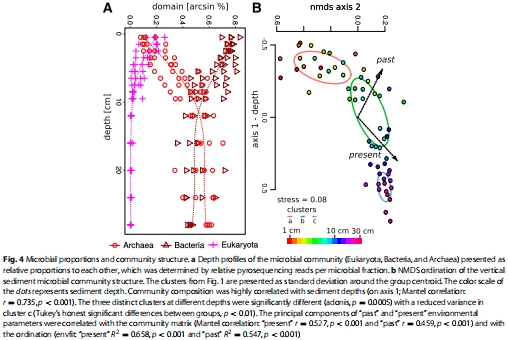 沉積物微生物群落存在劇烈的垂直更替:在30厘米的沉積剖面中,微生物群落發生了近乎完全的物種更替,支持了“生態位特化”模型,而非簡單的“嵌套”模型。