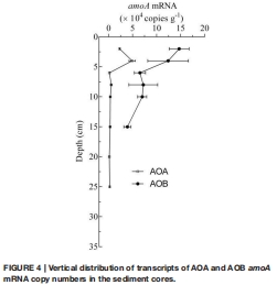 研究意義:這些數據直接揭示了AOA和AOB的垂直生態位分離。圖3顯示AOA基因豐度在表層(0-6厘米)比AOB高一個數量級,但圖4顯示AOB的mRNA表達量在表層(0-10厘米)遠高于AOB。這表明AOA是數量主體,但AOB是活性主體,反映了功能分工:AOB適應表層高氨環境,而AOA耐受深層缺氧。