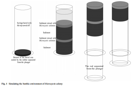 微宇宙系統構建:使用50毫升注射器筒構建實驗裝置(圖1),通過分層填充沉積物、微囊藻群體和過濾湖水,模擬真實的沉積物-水界面環境。裝置外層包覆錫箔紙以避光,頂部覆蓋透氣膜。
