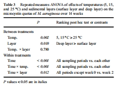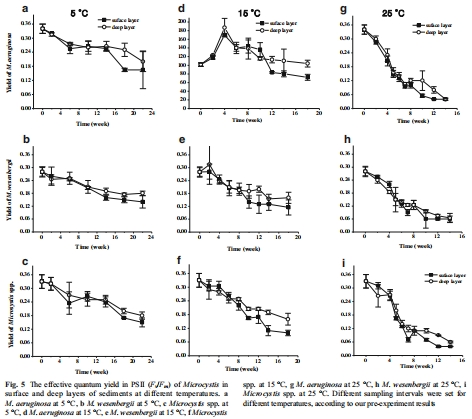 研究意義:這是最直接量化微囊藻在沉積物中存活能力的核心指標。圖2清晰地展示了溫度、沉積層深度和藻種對存活率的巨大影響。數據顯示,低溫(5°C)和深層厭氧環境能極有效地維持微囊藻群體的存活,而高溫(25°C)和表層好氧環境則導致群體迅速消亡。這些數據首次在受控條件下系統揭示了溫度是決定底棲微囊藻存活期限的首要關鍵因子,并證實了厭氧環境的保護作用。