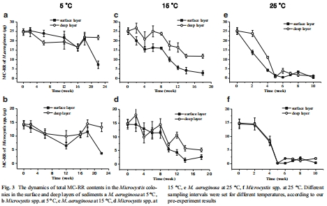 本論文摘要指出,微囊藻(Microcystis)群體可以在沉積物中越冬,并通過再增殖作用成為水體水華的“種源”,促進水華的連年發生。本研究通過微宇宙實驗,定量研究了底棲微囊藻在不同沉積條件下的存活能力,闡明了其細胞數量、光合活性和毒素含量的動態變化。研究發現,在 5°C下,沉積物中的微囊藻群體豐度在22周內沒有顯著下降;而在 25°C下,超過90%的底棲群體在3個月內死亡。處于表層好氧沉積物中的微囊藻存活率顯著低于深層厭氧沉積物。產毒的銅綠微囊藻(M. aeruginosa)和不產毒的惠氏微囊藻(M. wesenbergii)表現出相似的存活能力,但在15和25°C下,銅綠微囊藻的最終存活效率更高。在5和15°C下,微囊藻毒素(Microcystin)配額保持穩定,但在25°C下顯著下降。底棲微囊藻群體的光合活性逐漸降低,且溫度越高,下降速率越大。研究表明,大多數底棲微囊藻群體可以成功越冬,其毒素得以保存,光合活性得以維持,這顯著增加了水華形成的風險。然而,在亞熱帶淺水湖泊的沉積物中,它們無法多年累積。