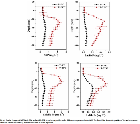 研究意義:該數據直接證明了溫度升高顯著增強沉積物微生物活性。圖1顯示,在0-8毫米表層沉積物中,微生物活動在25°C時比7°C增加了252%。這解釋了溫度促進P動員的生物學驅動因素,因為微生物呼吸加劇會消耗氧氣,推動厭氧條件形成,進而觸發Fe還原和P釋放。