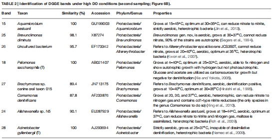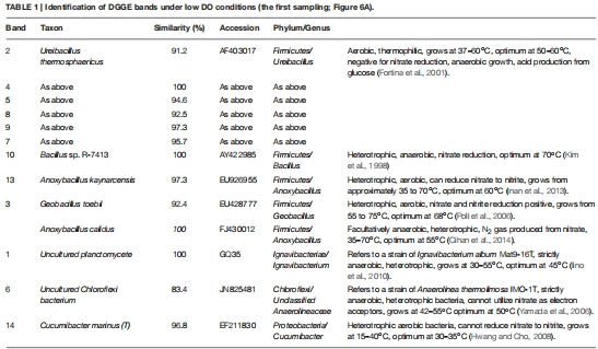 數據來源:圖6(caption: "Representative DGGE strips of samples")和表1-2(物種鑒定結果)。