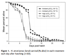 溫度是主導脅迫因子:預測的世紀末升溫(19°C)對美國龍蝦幼蟲的負面影響遠大于酸化(750 ppm pCO2)。高溫顯著降低了幼蟲的存活率,盡管它加速了發育進程。