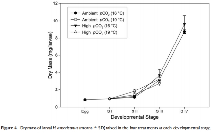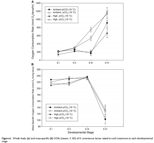 pCO2效應具有條件依賴性:高pCO2本身對存活率沒有直接負面影響,但其效應與溫度存在顯著的交互作用。在環境溫度下,高pCO2表現出一定的“積極”效應(如促進生長);而在高溫下,高pCO2則刺激了IV期幼蟲的活動和攝食行為。