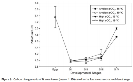 研究意義:C:N比可以反映生物體的生化組成和能量儲存狀況。較高的C:N比通常意味著更高的脂肪儲存或更低的蛋白質含量。研究發現高pCO2處理下的IV期幼蟲有更高的C:N比。