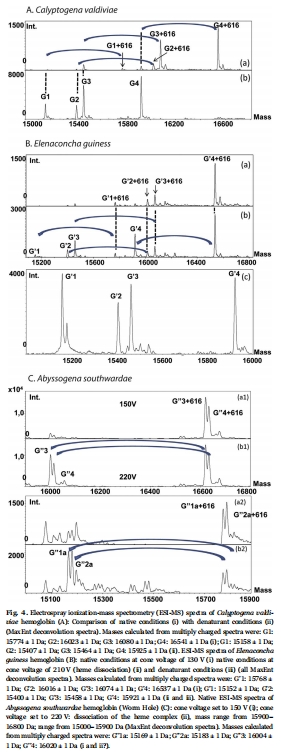 血紅蛋白結構數據:通過質譜分析,確定每個物種的血紅蛋白由4種分子量略有不同(15-16 kDa)的單體組成,且在自然狀態下不形成多聚體。這些關鍵數據總結在文檔中的表4,原始譜圖見圖4。