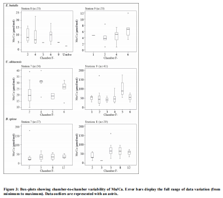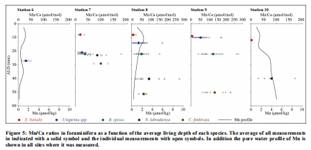 Mn/Ca比值確鑿地反映了微棲息地:在所有站點,淺底棲種 E. batialis的Mn/Ca比值最低,中間底棲種 Uvigerinaspp. 和 B. spissa次之,深底棲種 N. labradorica和 C. fimbriata最高。這證明有孔蟲殼體Mn/Ca是其棲息深度的可靠指標。