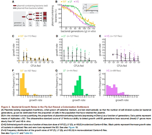 多時間點動態監測:在灌喂細菌后的不同時間點(最長達20天),檢測單個果蠅的腸道細菌載量、定植比例,并計算細菌的生長、死亡和脫落速率。