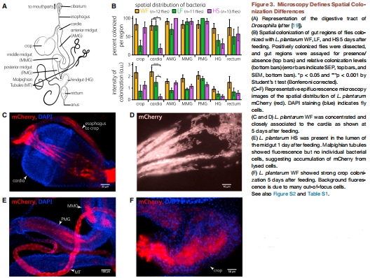 使用多種菌株進行對比:選取了三種來源不同的植物乳桿菌(Lactobacillus plantarum)菌株:WF(野生果蠅分離)、LF(實驗室果蠅分離)和HS(人類胃腸道分離),以比較其定植能力的差異。