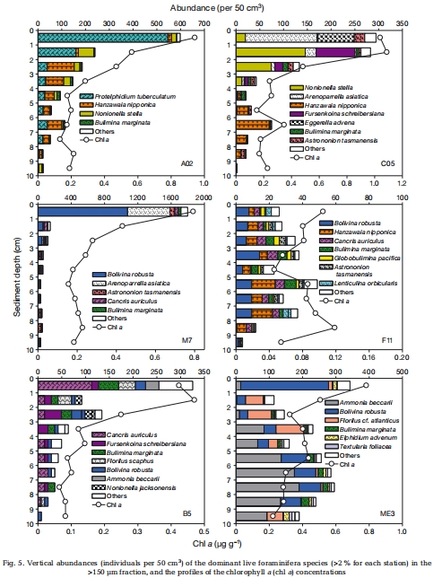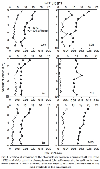 食物和氧氣共同控制分布:有孔蟲的垂直分布受食物(植屑)的可獲得性和新鮮度以及沉積物的氧化還原條件共同控制。它們的豐度與葉綠素a濃度顯著正相關。