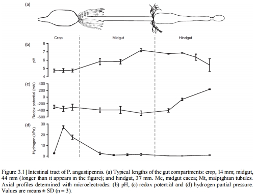 數據來源:Figure 3.1(caption: "Axial profiles of intestinal pH, redox potential, and hydrogen partial pressure in the gut of wood-feeding cockroaches")。