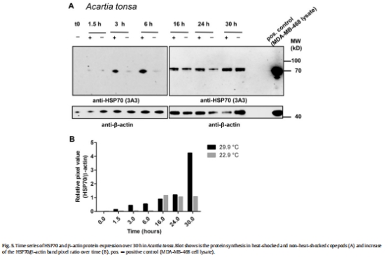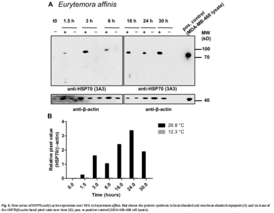 數據來源:文檔圖5展示了A. tonsa的HSP70/β-actin蛋白條帶比值隨時間的變化;文檔圖6展示了E. affinis的相應數據。