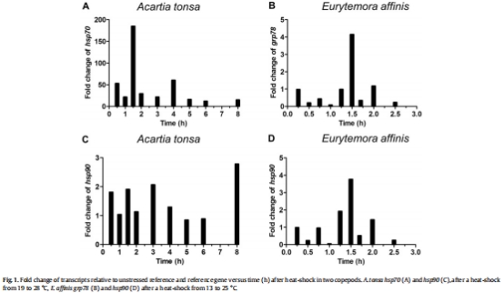 數據來源:文檔圖1展示了熱應激后hsp基因表達隨時間變化的時間序列;文檔圖2A和 文檔圖3A,3B展示了A. tonsa和E. affinis在不同溫度階梯下的基因表達響應;文檔圖2C和 文檔圖3C,3D展示了馴化對基因表達的影響。