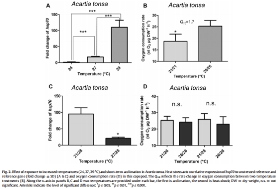 量化急性熱應激如何影響兩種橈足類在分子水平(熱休克蛋白基因轉錄和翻譯)和個體水平(代謝率)的響應。