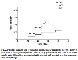 研究意義:這是評估生物對不同食物適應性的最直接指標。結果表明高營養質量的食物(動物性)顯著提高了生存率,而低質量食物(藻類、碎屑)導致高死亡率,反映了食物質量對種群存活的關鍵影響。