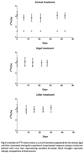 數據來源:δ13C隨時間變化的曲線展示在 文檔圖5中;δ15N的數據展示在 文檔圖6中;C:N比的變化展示在 文檔圖3中。食物和端足類的初始同位素與元素組成總結在 文檔表4中。