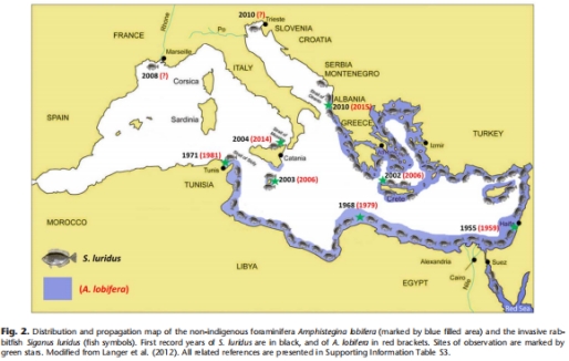 兔子魚與有孔蟲的擴散時空數據:收集并對比兩者在地中海首次發現的記錄。