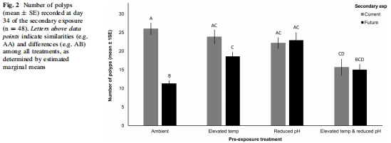 二次暴露階段(34天):將經(jīng)過預(yù)暴露的親代息肉及其在預(yù)暴露期間產(chǎn)生的子代息肉,分別轉(zhuǎn)移到兩種最終氣候情景下:① 當(dāng)前條件(25°C, pH 8.0)和② 未來?xiàng)l件(28°C, pH 7.6)。